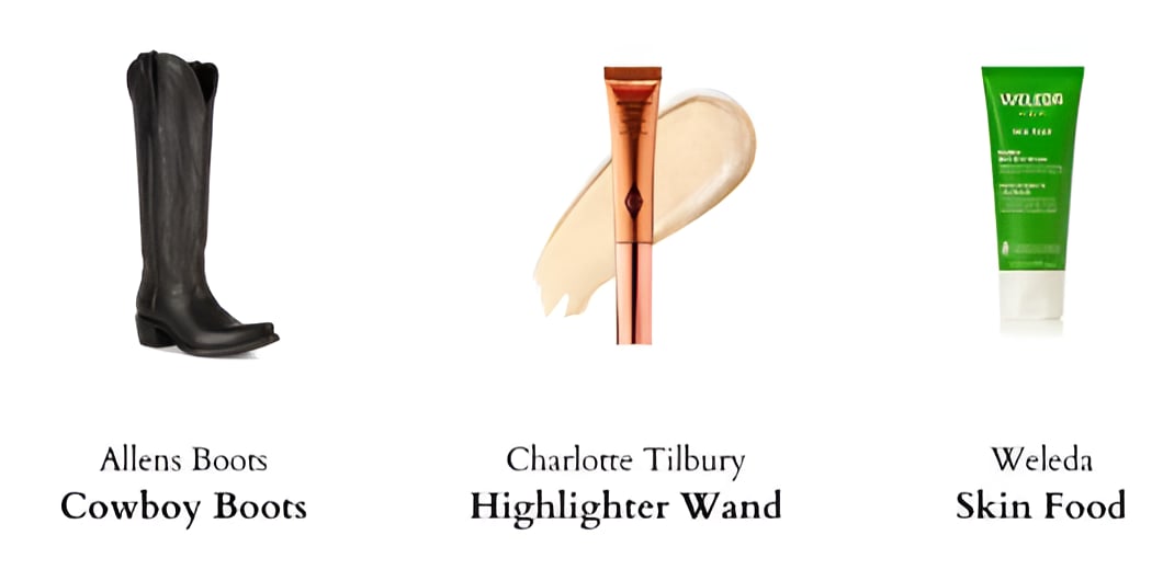 My black lab Gypsy, cowboy boots, Charlotte Tilbury Highlighter Wand, Weleda Skin Food, and UT football games.