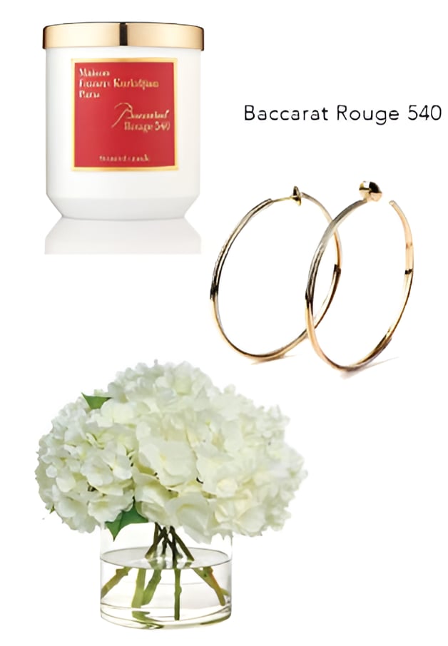 White Hydrangeas, Baccarat Rouge 540 Candle, Gold Hoop Earrings, Traveling — Particularly Mexico and Europe, Nike Sneakers + Workout Clothes.