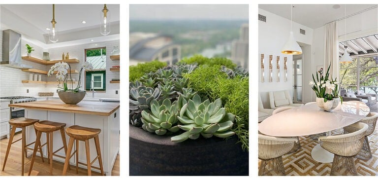 Plant arrangements are simple yet stunning, modern, and just another way to add that perfect touch of greenery. Our go-to sources for all plant-related needs are East Austin Succulents, New Native Gardens, and Thompson + Hanson.